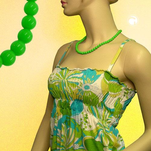 Zeitlos schöne lindgrüne Halskette, bestehend aus 8mm großen hochwertigen hellgrün-glänzenden Kunststoffperlen. Mit seiner apfelgrünen Farbe ist das klassisch gefädelte Collier die perfekte Ergänzung zur sommerlichen Kleidung. Die 50cm lange, im Volksmund Kullerkette genannte Perlenkette wird mit einem silberfarbenen Karabiner plus Verlängerungskettchen aus eloxiertem Aluminium verschlossen. Farbiger Schmuck betont die Farben der Kleidung oder setzt zusätzliche Akzente. Alle Bestandteile dieser Modeschmuck-Kette wurden in Deutschland produziert und die Kette selbst in Handarbeit – made in germany – fertiggestellt.