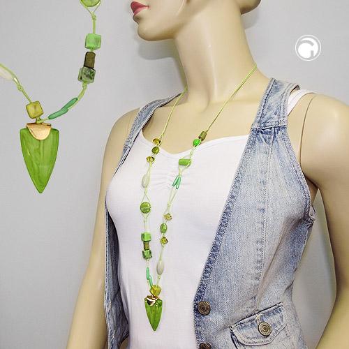 Diese fantasievolle Kette in verschiedenen Grün und Mint-Tönen könnte sich in diesem Sommer zu Ihrem ganz persönlichen Highlight entwickeln! Das Dreieck aus Kunststoff wird durch die Kombination mit verschiedenen Kunststoff-Teilen in Hellgrün, Mint und Oliv raffiniert in Szene gesetzt. Die 2-fach Kordel hellgrün ist längenverstellbar mittels Schiebeknoten und bietet dadurch vielfältige Tragemöglichkeiten. Ein Artikel aus unserer aktuellen Sommerkollektion, in Handarbeit gefertigt.